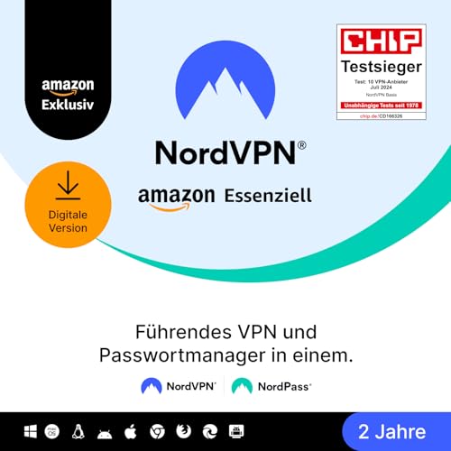 NordVPN Amazon Essenziell, 10 Geräte, 2 Jahre, VPN & Passwort-Manager, Digital-Code | 99,99 € | Zum Produkt |